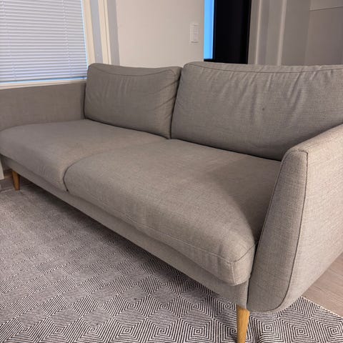 Ikean harmaa kahdenistuttava sohva, tarkkaa mallin nimeä en muista eikä löydy etiketistä. Irrotettavat istuin- ja selkätyynyt, joista päälliset voi irroittaa ja pestä (kuvassa 3). Kummassakin sivussa käsinojien ulkopuolella kätevät taskut (kuvassa 2).