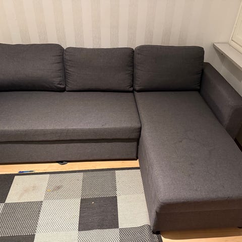 Hyvässä kunnossa oleva sohva rahilla. Divaaniosan syvyys 180cm, sohvan leveys 265cm. Istumakorkeus 45cm ja korkeus selkänoja 85cm. Rahin koko 84*58cm. Kangas samettinen ja hyvässä kunnossa, muutamassa kohdassa näkyy koiran raapimisjälkiä jotka saattavat lähteä silittämällä/höyrypesurilla. Kangas täysin ehjä kuitenkin.
