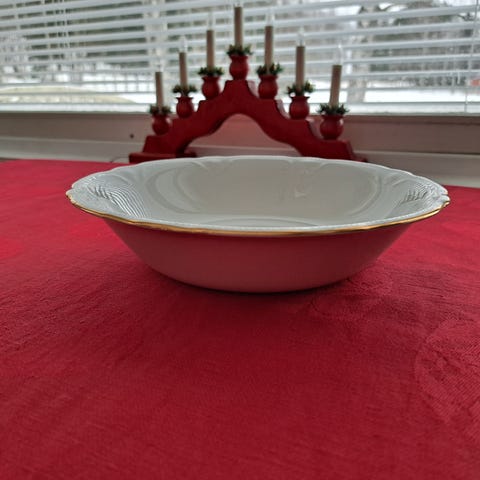 Materiaali: Valkoista posliinia, jossa on kultareunus. Kultareunuksessa pientä kulumaa.