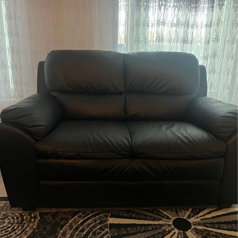 Iskun valkoinen nahkasohva, 2-istuttava malli.