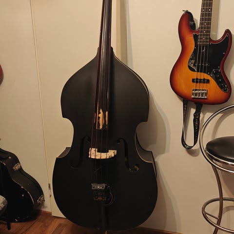 Käsintehty kontrabasso, ns. silent malli tällä hetkellä. Tarkoitus oli mikittää, mutta jäi minulta tekemättä. Tästä siis seuraavalle innokkaalle projektia tai tällä pääsee harjoittelemaan soittoa pienellä volyymilla.