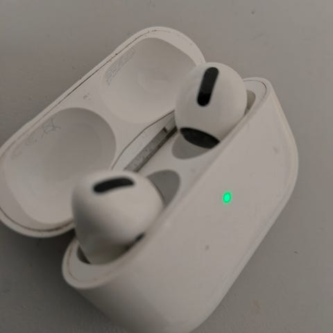 Apple AirPods Pro langattomat kuulokkeet, joissa minimaaliset käytönjäljet. Mukana latauskotelo, USB-C Lightning -kaapeli sekä useita korvasoviterenkaita. Kuulokkeet tarjoavat aktiivisen melunvaimennuksen ja mukautuvan äänenlaadun. Soveltuvat langattomaan kuunteluun ja puheluihin.