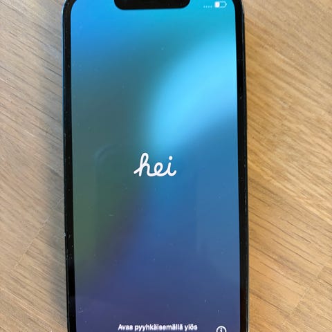 Apple iPhone 13 Mini -älypuhelin, jossa on 128 gigatavua tallennustilaa. Etu ja takalasissa säröjä puhelin muuten ehjä.