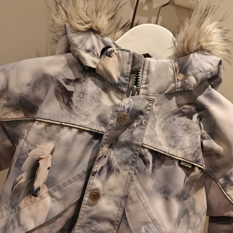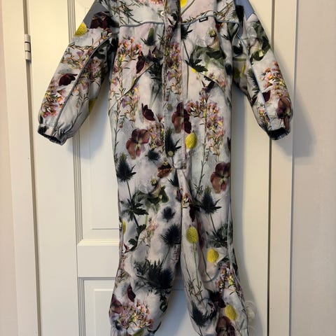 Käytön jälkiä näkyvissä: lahkeissa ja pepussa pehmentymää/kulumaa Molon värikkäälle kuosille tyypillisesti. Hupun kiinnityksestä puuttuu yksi neppari.