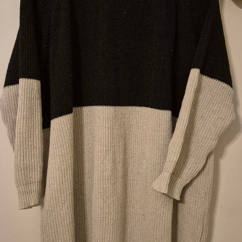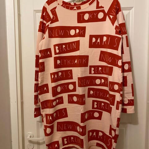 Mustavalkoinen Papun puuvillainen neulemekko. Kokomerkintä S, mutta reilu koko. Kai-kai n. 62 cm, olka-helma 90 cm. Moitteeton kunto.