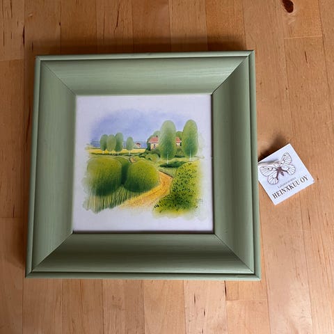 Myydään kaunis vaaleanvihreissä puukehyksissä oleva taulu, jossa on keraaminen Kielo kukkapostimerkki. Postimerkin koko on 5*5 cm ja taulun koko 20,5*17,5 cm.