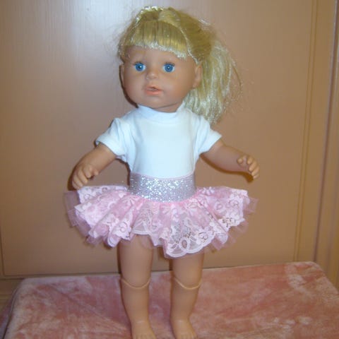 43 cm nukelle (baby born tai sister) trikoosta valkoinen body, jossa takana pukemista helpottava tarrakiinnitys. Irrallisessa tutussa alla kerros napakkaa tylliä ja päällä hopeakimalteista pitsiä, vyötäröllä kimaltava kuminauha.