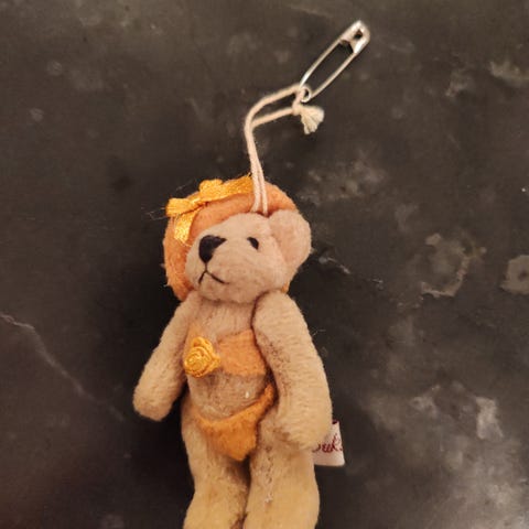 Nallen pituus 10cm, pituus metallikiinnittimestä nallen varpaaseen 17cm.