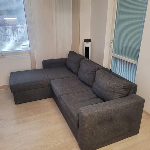 Divaanisohva. Ehkä askolta ostettu aikoinaan. Haku pois mahdollisimman nopeasti. Ensin ollut vanhempien luona, käytetty hyvin vähän. Muutaman kuukauden meillä ollut käytössä. Ollut koirataloudessa.