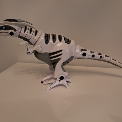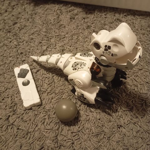Dino robotti, liikkuu päästä painamalla. Kaipaa kuitenki uusia pattereita