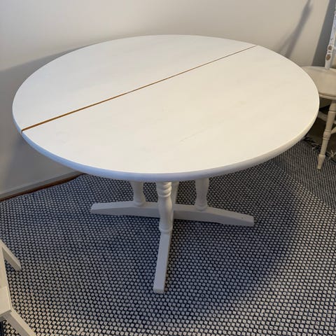Myydään uuden tieltä pyöreä valkoinen pöytä vaalean puun värisillä jaloilla ja 4 valkoista tuolia mustilla istuinosilla.