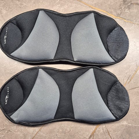 Nilkka- ja rannepainot, yhden paino on 0,5 kg. Hyväkuntoiset, tarranauhakiinnitys. Yhteishinta.
