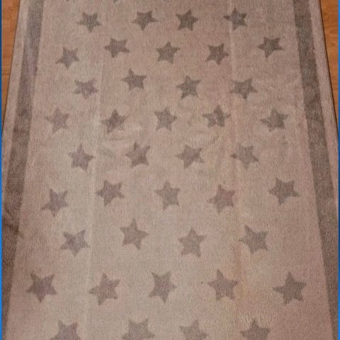 Harmaa matto valkoisilla kuvioilla. Yleisilme siisti.