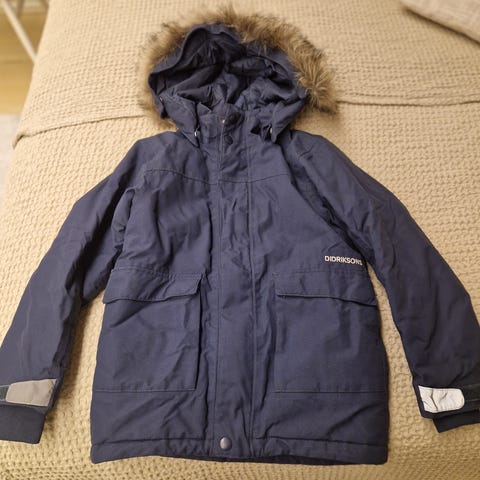 Meille uutena tullut ja pari kertaa päällä ollut didriksons toppatakki. Kokomerkintä 120, mutta vastaa mielestäni 110/116. Todella paksu ja lämmin. Irroitettavat hihat eli saa myös toppaliiviksi.