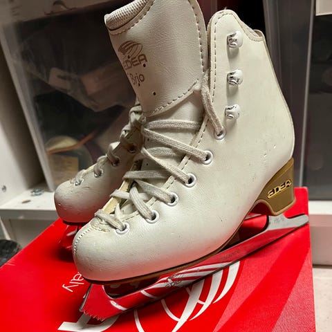 Edea kaunoluistimet, sisämitta 20 cm. Harjoittelun jälkiä on pinnassa mutta kaikin puolin hyvässä kunnossa seuraavalle luistelijalle.