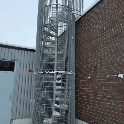 Mustat metalliset kierreportaat, joissa on kaide. Portaiden rakenne on kestävä ja soveltuu sisätiloihin. Soveltuu tiloihin, joissa tarvitaan tilaa säästävä ratkaisu kerrosten välillä liikkumiseen.
