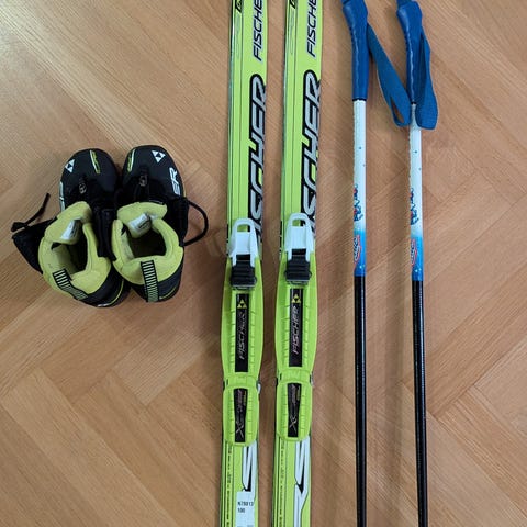 Fischer lasten sukset, pituus 100 cm. Mukana sauvat ja siteet. Toisesta sauvasta puuttuu piikki.