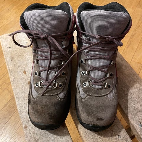 Yhden kauden ajan perheen teinin vaelluskäytössä olleet naisten vaelluskengät. Huollettu koko ajan hyvin; täysin ehjät sekä ulkoa että sisäpuolelta.