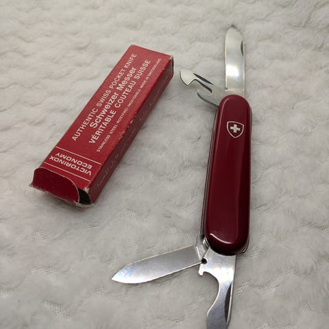 Myydään käyttämätön safiirinsininen monitoimilinkkuveitsi Victorinox, jossa Suomen Leijona -painatus.