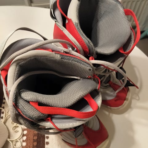 Myydään paljon käytetyt lumilautakengät. Koko 41, sisämitta 275mm. Narut hieman rispaantuneet ja oikeassa edessä pieni halkeama, tästä kuva.