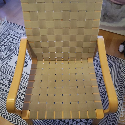 Musta runko, päällinen vaalea nahka. Kunto on muuten hyvä, mutta toisesta keinun jalasta on kulmat kuluneet. Näkyy kuvassa. Leveys 67, korkeus 90.
