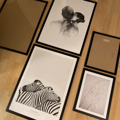 Kaksi mustavalkoista valokuvaa julisteina, joissa mustat kehykset.