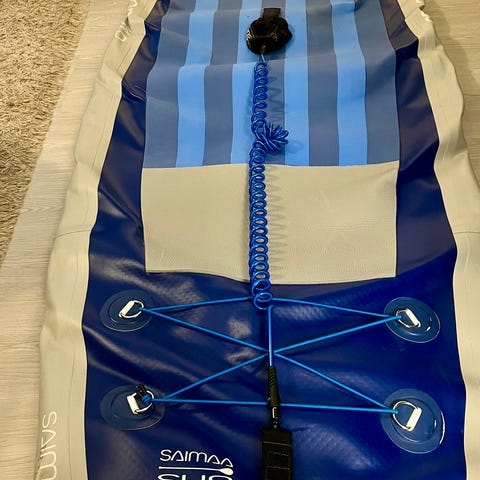 Mukana kaikki alkuperäis varusteet: jalkaremmi, pumppu, korjaus setti, kantoreppu, evä sekä mela.