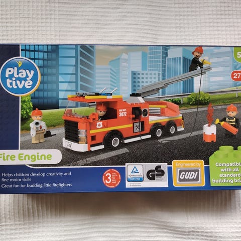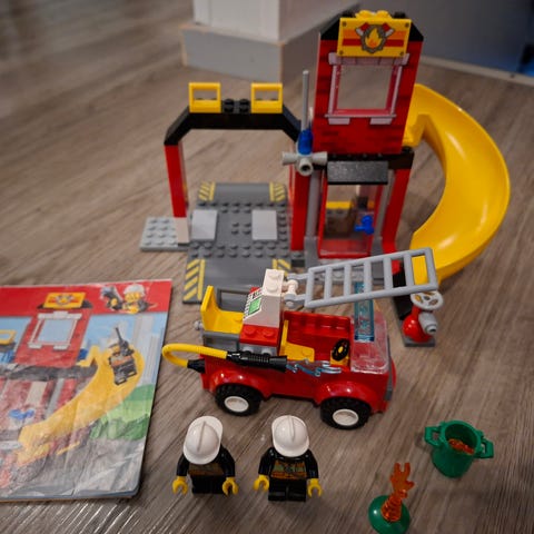 LP (sopiva legoihin merkki) paloasema ja paloauro rakennuspalikat, ei kaikki osia ovat tallessa, mutta tässä on ehkä kaksi settiä sekoitettuna. Isolla alustalla 40 × 20.5 cm.