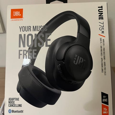 JBL Tune 775BT langattomat kuulokkeet mustassa värissä. Kuulokkeet tarjoavat aktiivisen melunvaimennuksen (ANC) ja Bluetooth-yhteyden. Mukana USB-latauskaapeli ja 3,5 mm äänikaapeli.