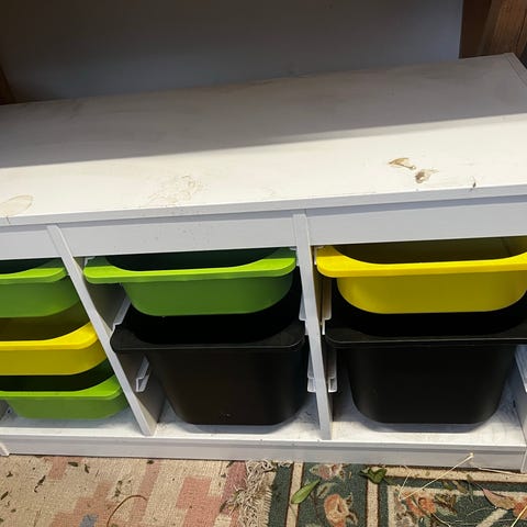 IKEA lastenhuoneen säilytyskaappi värillisillä muovilaatikoilla
