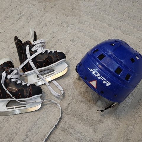 Hyvä kuntoiset luistimet koko 27 ja pohjalliset. Mukaan vanha, mutta ehjä ja toimiva kypärä.