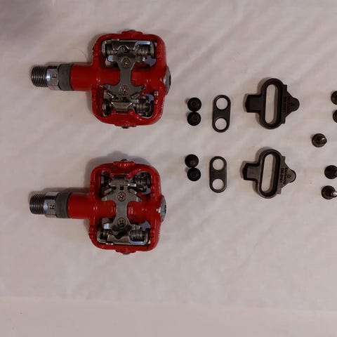 Hyväkuntoiset Look-lukkopolkimet ja kaupanpäälle käytetymmät klossit ja ruuvit.