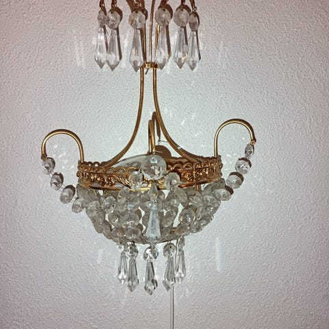Seinävalaisin, jossa kristallikoristeita. Valaisimet on varustettu kultaisilla varjostimilla. Sopii sisätilojen valaistukseen ja koristeeksi. Vain nouto
