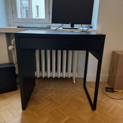 Annetaan Ikean tummanruskea pöytälevy ja jalat, joilla voi säätää pöydän korkeutta. Yksi kulma rikki (näkyy kuvassa). Käytetty työpöytänä sekä tarjoilupöytänä. Helppo säilyttää ja koota!