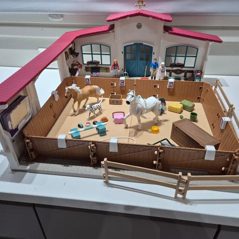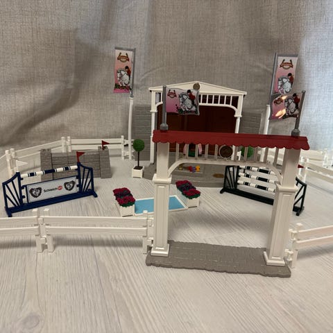 Myydään uudenveroinen, vain kerran kasattu ja purettu pois oleva Schleich Peppertree ratsastusareena. Mukaan viimeisessä kuvassa olevat ympyröidyt tavarat.