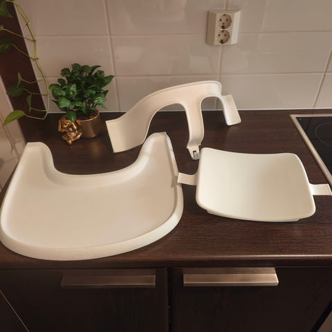 Myydään yhdessä tai erikseen Stokken valkoinen Tripp Trapp -syöttötuoli, tummansininen Baby Set sekä valjaat. Tuolissa kaatumisen estävät lisäpalat. Tuolia on käytetty ahkerasti, maalipinnassa paikoitellen sanomista, mutta edelleen tyylikäs ja toimiva kokonaisuus seuraavalle.