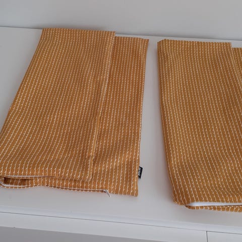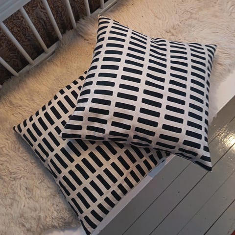 2 kappaletta itse ommeltuja tyynynpäällisiä Artekin Siena kankaalla 50cm tyynylle. Valkoinen piilovetoketju.