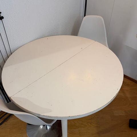 Pyöreä musta ruokapöytä metallijalalla ja neljä mustaa tuolia. Pöytä ja tuolit soveltuvat ruokailukäyttöön keittiö- tai ruokailutilassa. Tarjolla su 25.1.2026 saakka, vain nouto Herttonimestä