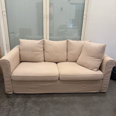 Jysk Norefjell vuodesohva harmaa kangaspäällysteellä. Sohva toimii sekä istuimena että vuoteena, sopii tilaan, jossa tarvitaan monikäyttöistä kalustetta.