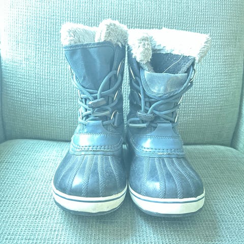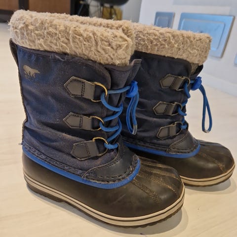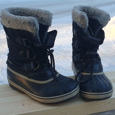 Mustat Sorel-talvikengät, koko 32. Kengät sopivat myös loskakeleille saapasmaisen alaosan vuoksi.