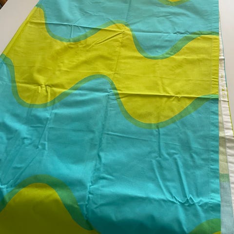 Limen vihreät Marimekon Lokki-verhot. Pituus 195 cm, leveys 130 cm. Verhot on pesty mutta niissä on tahroja, joita en ole yrittänyt erikseen poistaa.