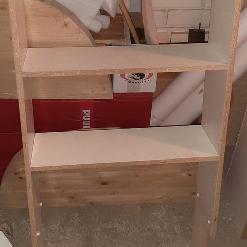 Valkoinen ja puunvärinen tikashylly. Kaikenlaista kulumaa hyllylevyissä käytöstä mutta yleisilme todella hyvä ja siisti.
