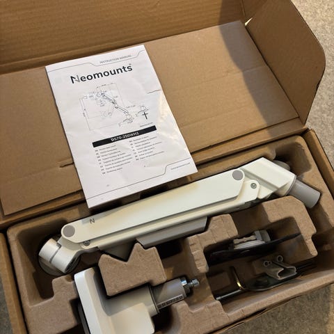 Neomounts merkkinen valkoinen, näyttävämonitorivarsi. Varsi on laadukas ja hyvillä säädöillä varustettu.