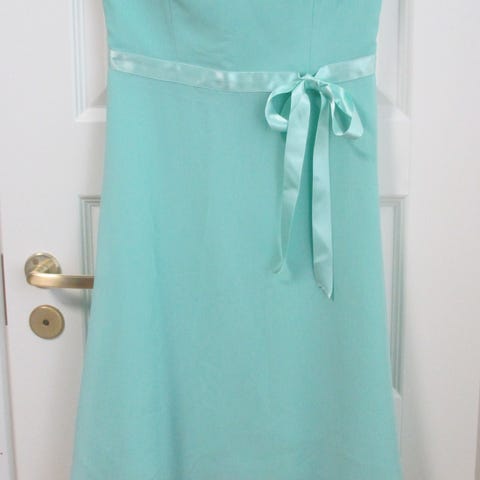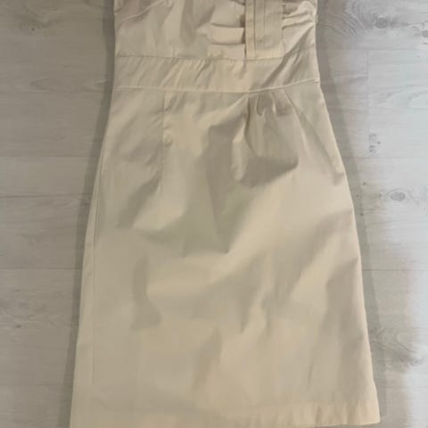 Olkaimeton ja vuoreton mekko, kokomerkinnät hävinneet, kokoa S/36. Hameosan pituus 58 cm.