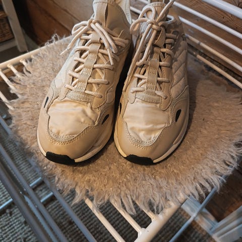 Kokonahkaiset nilkkurit, paitsi kärki ja kanta kumia. Joitakin satunnaisia käyttökertoja muiden kenkien ohella. Väri luonnonvalkoinen/beige. Koko reilu 38. Sisämitta 24,2 cm.