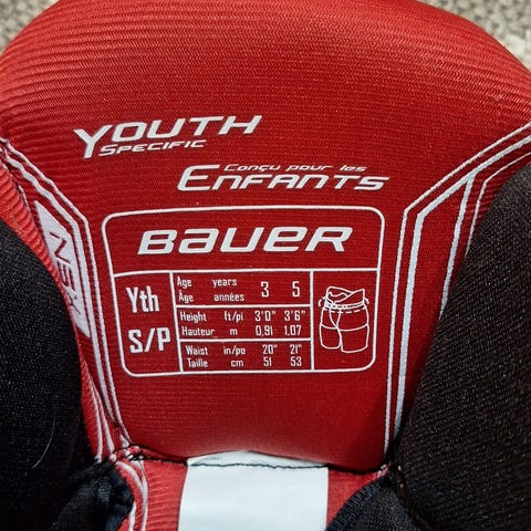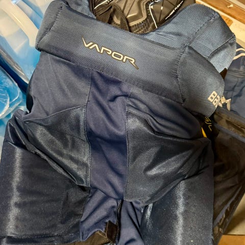 Hyvässä käytetyssä kunnossa olevat Bauerin sr L MV housut. Perus käytön jälkiä on mutta se kuuluu asiaan. Toisessa kuvassa on kohta josta on vähän saumaa parsittu.