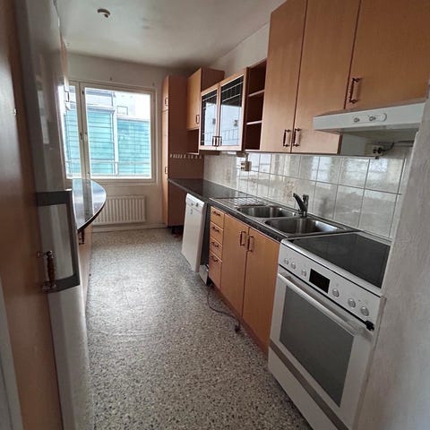 Pieni, valkoinen keittiökaapisto, 50cm Rosenlew -sähköhella ja 60x175 Electroluxin jääkaappipakastin, joka on vain muutaman vuoden vanha. Muun keittiön ikä ei ole tiedossa.