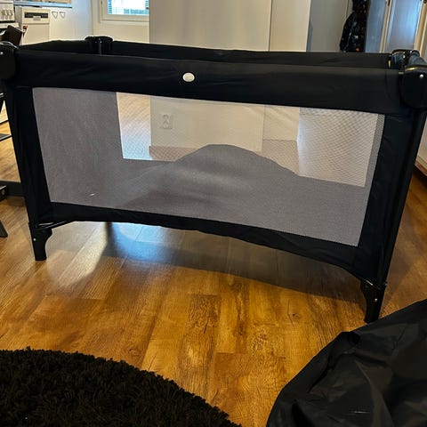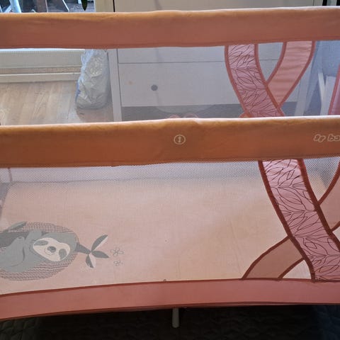 Emma-merkkinen matkasänky pohjalla, kantokassilla sekä vauvan korotusosalla. Päädyssä ei ole luukkua.