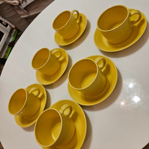 Astiat ovat n. 25 vuotta vanhoja. Ne ovat vanhempaa tuotantoa, kauniin keltaisen värisiä. Täysin ehjät, siistit ja käytetty max. viisi kertaa. Kaj Franckin suunnittelema.