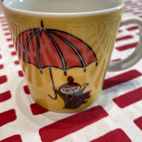 Arabia Muumi muki, jossa keltainen tausta ja sateenvarjoa pitelevä Muumihahmo. Materiaalina posliini.